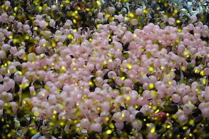 Reveler film and catch falling balloons and confetti as they celebrate the start of 2026 during the New Year countdown event held at a shopping mall in Beijing, early Thursday, Jan. 1, 2026. (AP Photo/Andy Wong)