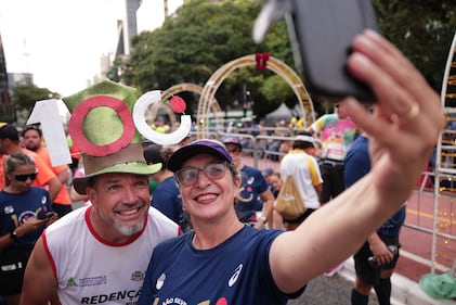 A couple takes a selfie during the Sao Silvestre road race held on New Year's Eve in Sao Paulo, Brazil, Wednesday, Dec. 31, 2025. (AP Photo/Ettore Chiereguini)