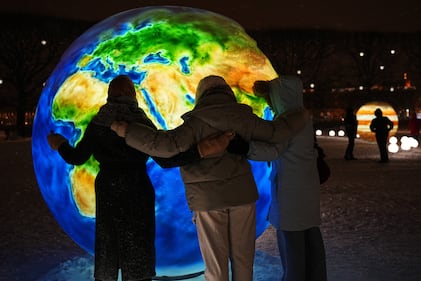 Women hug a glowing ball depicting the Earth at a square decorated prior to Christmas and New Year festivities in St. Petersburg, Russia, Tuesday, Dec. 30, 2025. (AP Photo/Dmitri Lovetsky)