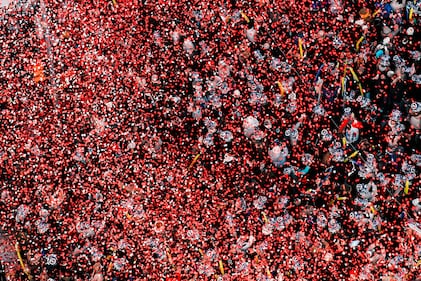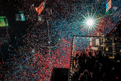 Confetti falls in red, blue, and white over attendees in Times Square during New Year's Eve celebration as part of the 250-year anniversary, or Semiquincentennial, of the United States, Thursday, Jan. 1, 2026, in New York. (AP Photo/Eduardo Munoz Alvarez)