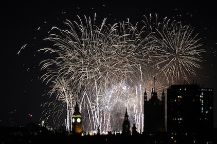Fireworks light-up the sky in central London to celebrate the New Year on Thursday, Jan. 1, 2026. (AP Photo/Alberto Pezzali)