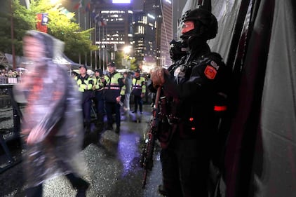 The police stand guard during the 2026 Taipei New Year's Party celebration in front of the Taipei City Government Building in Taipei, Taiwan, Wednesday, Dec. 31, 2025. (AP Photo/Chiang Ying-ying)