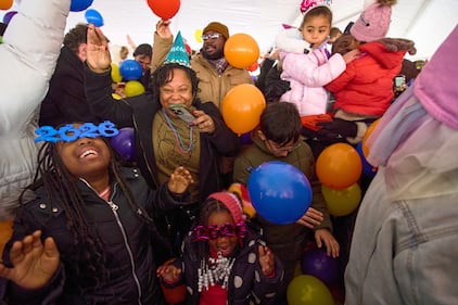 Cori Johnson, 9, left, her mother Robin Hawkins-Johnson, and friend Kori Simms, 6, all of Washington, react during a noon balloon drop celebration ahead of New Year’s Eve, at The Yards Park, Wednesday, Dec. 31, 2025, in Washington. (AP Photo/Jacquelyn Martin)