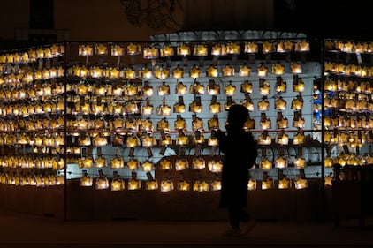 A Buddhist prays in front of lanterns on New Year's Eve at the Jogye temple in Seoul, South Korea, Wednesday, Dec. 31, 2025. (AP Photo/Lee Jin-man)
