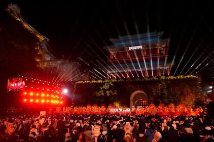 Performers and revelers ring in the new year at the Juyongguan Great Wall on the outskirts of Beijing, China, early Thursday, Jan. 1, 2026. (AP Photo/Ng Han Guan)