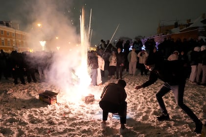 People celebrate and watch the fireworks for the New Year's celebrations, in Warsaw, Poland, Thursday, Jan. 1, 2026. (AP Photo/Czarek Sokolowski)