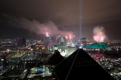 Fireworks explode over Las Vegas Strip casinos just after midnight during New Year celebrations Thursday, Jan.1, 2026, in Las Vegas. (AP Photo/Steve Marcus)