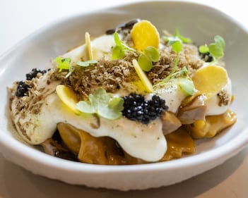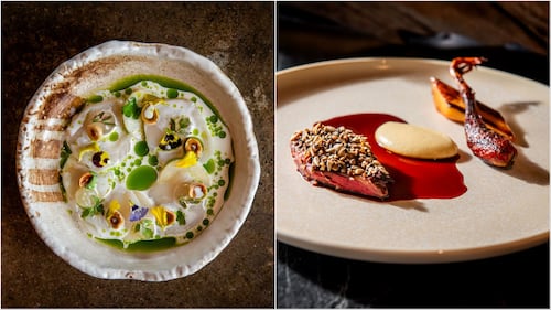These two dishes, from their $225 blind tasting menu that is constantly changing, feature some of the “best ingredients of the season from around the world,” says operations manager Mary Donison.