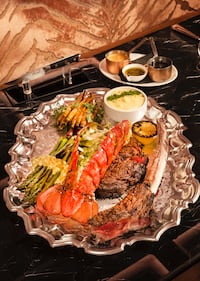“The Platinum Platter features a Tajima Wagyu Tomahawk from Australia — grass-fed, beautifully marbled, and simply delicious. The steak itself ranges from 55–60 oz. On the surf side, there’s a lobster tail about the size of a person’s forearm, weighing in at roughly 28–32 oz.”