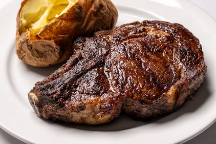 Their signature dish is dry aged bone-in rib steak and comes in 16 oz for $108 or 24 oz for $175. A choice of baked potato or French fries is included with the entrée.
