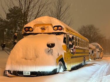 School buses covered a snow are parked outside Martin Grove Collegiate in Etobicoke on Sunday, Jan. 25, 2026. (Andrew Brennan/CP24)