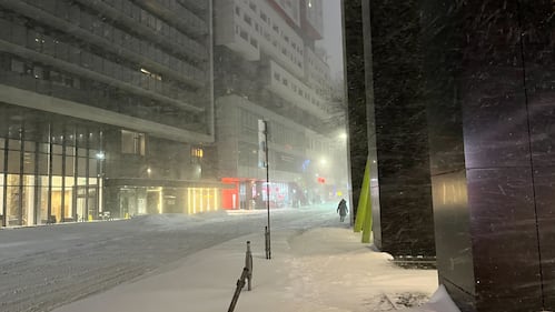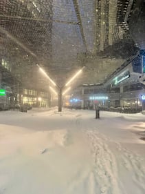 Large snow drifts are seen in downtown Toronto near Bay Street on Sunday, Jan. 25, 2026. (Lauren Socha)