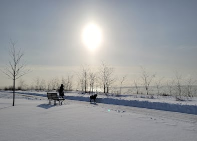 A person takes their dog for a walk on a trail overlooking Lake Ontario in Newcastle, Ont. on Monday, Jan. 26, 2026. THE CANADIAN PRESS/Doug Ives