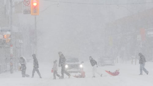 Pedestrians pull kids sitting on sleds at Heath St. and Yonge St. during a snowstorm in Toronto, January 25, 2026. (Lance McMillan/Toronto Star via Getty Images)