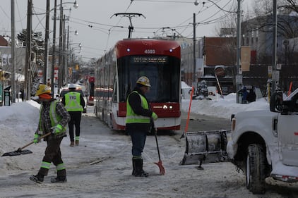 TTC crews dig out and get a derailed 501 streetcar back on track at Queen and Coxwell in Toronto, Jan. 26, 2026. (Steve Russell/Toronto Star via Getty Images)