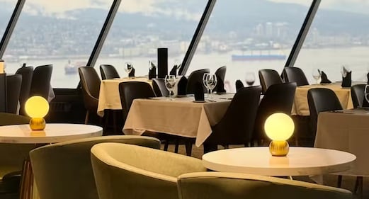 Top of Vancouver Revolving Restaurant, Vancouver, B.C. Located high above inside the Harbour Centre, guests can experience fine dining with picturesque views of Vancouver.