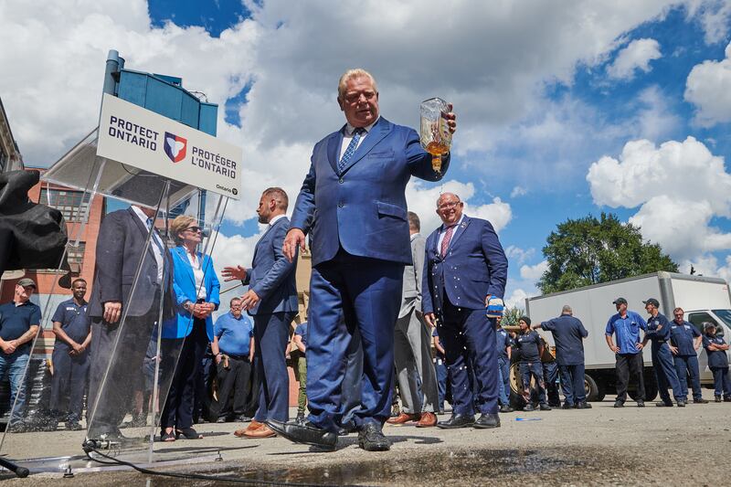 Following the announcement of the closure, Ford, during an unrelated news conference on Sept. 2, dumped a bottle of Crown Royal whisky in front of reporters.