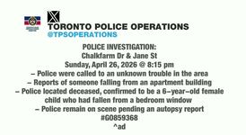 Opens in new window6-year old girl dead after falling from apartment building near Jane and WilsonOpens in new window00:24 · April 27, 2026 at 8:02AM EDT